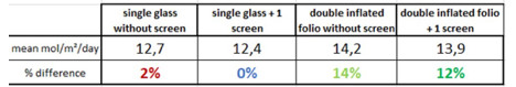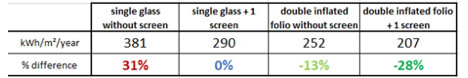The final numbers speak for themselves. The Hortinergy simulation shows how the single glass greenhouse without a screen would use 381 kWh/m2 per year to heat the greenhouse at 20 degrees Celsius during the day and 16 degrees Celsius during the night. With a screen, this number would go down to 290 kWh/m2. A double-inflated folio greenhouse would require only 252 kWh/m2 to reach the same temperature levels throughout the year. Adding a screen to it would result in an energy need of 207 kWh/m2.