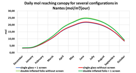 Daily mol reaching canopy for several configurations in Nantes (mol/m²/jour)