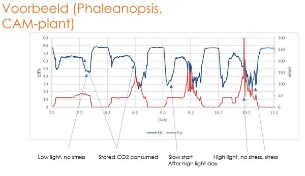As an example, Arie discussed Phalaenopsis with Bonte, a consultant specializing in potted plants (including orchids). This is a CAM plant, an abbreviation for Crassulacean Acid Metabolism. CAM plants, including many other ornamental plants besides orchids, close their stomata during the day to grow without drying out. With stomata closed, they cannot absorb CO2. With the CO2 they absorb at night, they also grow during the day. But when the stored CO2 supply runs out, it stops. Additional lighting is, therefore, pointless. The figures in the graphs shown also made that clear. The technical term 'malate dip' was mentioned. In that dip, the stored CO2 runs out.