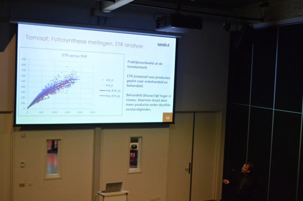 Both the students, the growers, and other interested parties were presented with a series of graphs during the afternoon, which, in addition to Arie, were also covered by Bonte de Jong of Phytoconsult and Robert Zuyderwijk of B+H Solutions. Arie especially dwelt on what can be discovered additionally by measuring photosynthesis efficiency. "With that, you measure the plant's engine. It also says something about the production of a plant."
