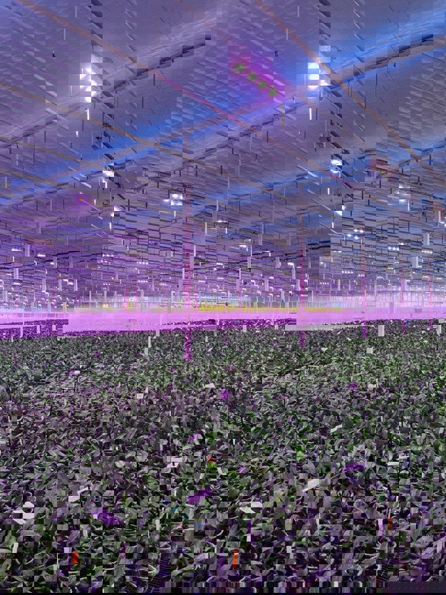 On average, Dutch orchid growers use a hybrid system with a spectrum of 90% red, 5% green, and 5% blue. Only a few growers have added far-red (switchable). The benefit of far-red is not yet entirely clear; however, it does seem that adding far-red, particularly during the darkest time of the year (from mid-November to the end of January), improves leaf color: red-leaved varieties in particular, turn much redder under full LED without far-red. This red color is caused by anthocyanin, which is produced by the plant to protect itself from stress factors, in this case, light. In the finishing phase, far-red ensures faster flowering, but the difference with lighting without far-red is, at most, a few days, Plantlighting’s research has shown. In practice, it can be observed that with far-red, the branch length increases by several centimeters. It should be noted, however, that the differences between varieties are significant.