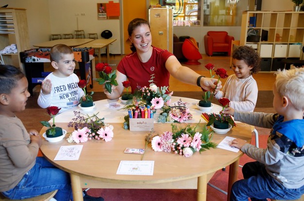 In the run-up to October 1, various activities with flowers together with and for children and the elderly will be organized. These include after-school care, care homes, and a festival in Almere, the Netherlands. At Humanitas Residential and Care Centre in Deventer, the kick-off took place on Thursday, September 28, and at Partou Kinderopvang (children's daycare), a national organization with around 700 branches, children made flower decorations for grandparents. The flowers for the action, colorful spray roses, were provided by growers of World of Sprayroses. Willemsen Flowers from Apeldoorn, Coloriginz from de Kwakel, Oasis, and Chrysal were also supporting the flower workshops.