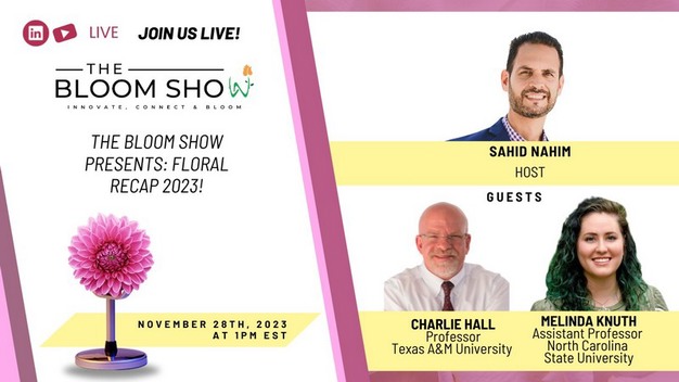 The grand finale of the 2023 The Bloom Show will take place on November 28, 2023, at 1 p.m. EST. Dr. Melina Knuth and Dr. Charlie Hall, will join their host, Sahid Nahim of Above All Flowers and New Bloom Solutions. They will share the latest floral industry trends, economic impacts, pricing effects, and the role of sustainability in shaping the industry's future.