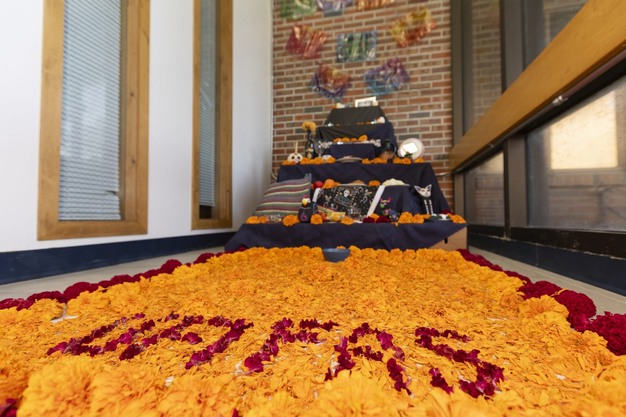 The ofrenda at Fifield Hall is decorated with a walkway of marigold petals and bulbs in the front and adorned with two photographs of loved ones, painted guardian animal statues called “alebrijes,” a pumpkin with traditional skull face paint and food as gifts for the deceased.