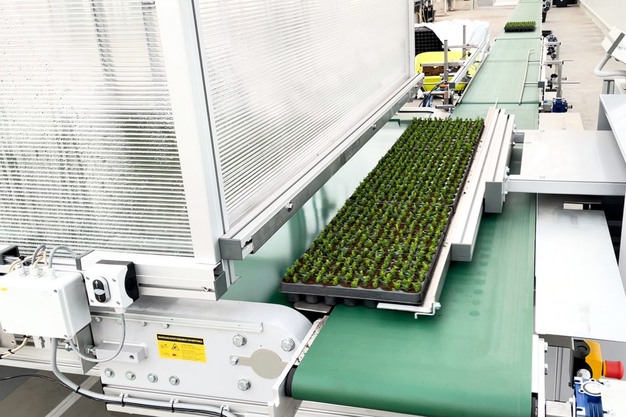 The Mayer PT 5000 was integrated as part of the associated new planting line. The buffer table can be individually adapted to the needs of our customers and can be integrated into complete systems. Just like in the Janßen Group’s new planting line. Mayer manufactured a mist irrigation system above the buffer table according to the customer’s individual requirements, plus a frame made of double-webbed panels and the opening mechanism via remote control from the forklift. The planting line on two levels with performance-adapting PLC control and the option of documenting the work output via Ethernet or USB interface.