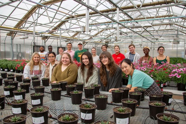 UGA horticulture students pose among the hundreds of ornamental plants they cultivated for student-run sales.