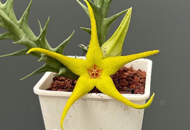 "Our third introduction is the extremely interesting and unique Orbea caudata. The Orbea is a low-growing succulent featuring 3-4” olive-green stems that feature teeth like edges. The flower is a stunningly unique yellow star shape that is truly a remarkable sight. The flower will bloom in late summer and early fall. this is a uniquely beautiful succulent that is ideal for any warm weather garden."