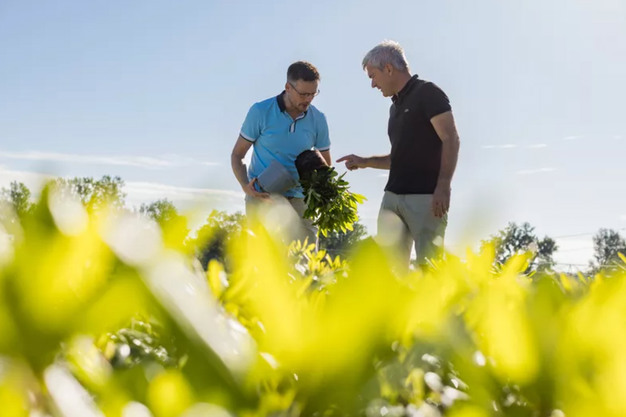 Tom Leybaert (r) is examining plant growth with Jiffy’s account manager, Lars Tolenaars. The Belgian grower is conducting tests with substrates containing less peat