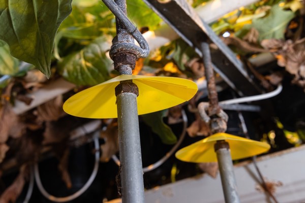 The result is the yellow Sticky disc, a one-sided sticky disc with a cut-out core and equipped with a click system. The Sticky disc is available in 2 diameters: 132 mm for stands of cultivation gutters and 165 mm for drain hoses and water hoses. It is a choice to apply these Sticky discs during the cultivation change of gerbera, then all points are easily accessible.