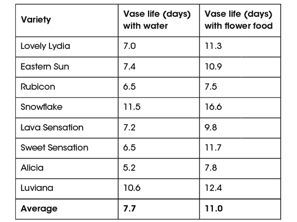The postharvest characteristics and vase life varied depending on the variety. The average vase life with water was 7.7 days, whereas the average vase life with flower food was 11 days. All varieties attained 7 or more days of vase life with flower food.