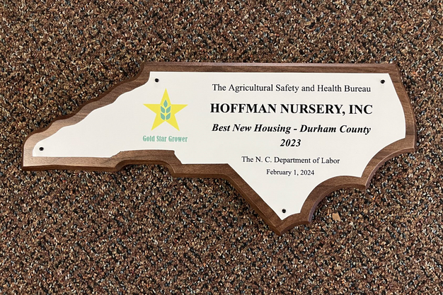 The North Carolina Department of Labor's Gold Star Grower Housing Program identifies growers who provide housing that meets and exceeds all requirements of the Migrant Housing Act of North Carolina. The housing standards are required by law and used during annual inspections performed by the Department of Labor's Agricultural Safety and Health Bureau. Over 1,800 houses are inspected yearly, and four awards are given statewide: two for "best-maintained housing" and two for "best new housing." Hoffman Nursery received a Best New Housing Award.