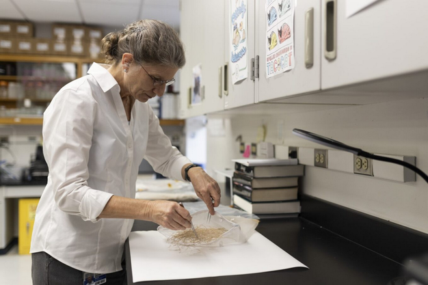 Anna-Lisa Paul, UF/IFAS horticultural sciences professor, examines plants grown on the International Space Station. Photo: UF/IFAS