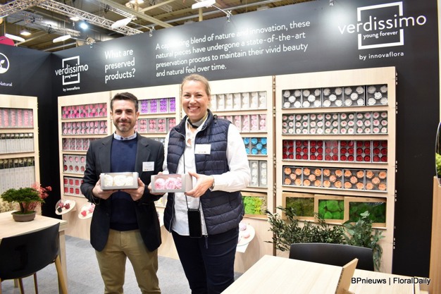 Alfonso Casamitjana and Stefanie Proy at the IPM Essen 2024 presenting the preserved peonies.