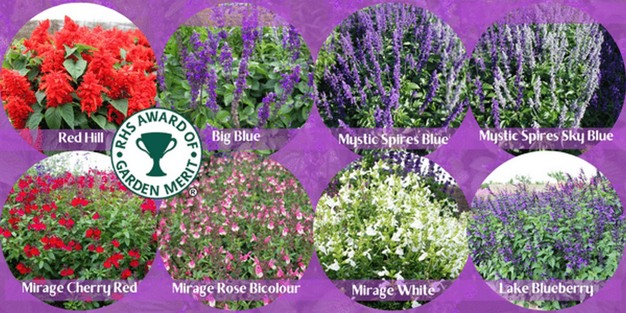 The eight new awards of Garden Merit that were earned during the Salvia Trial are Salvia splendens 'Red Hill' (Hem Genetics), Salvia 'Big Blue' (PanAmerican Seed), Salvia 'Mystic Spires Blue' (Florensis), Salvia 'Mystic Spires Sky Blue' (Florensis), Salvia greggii 'Mirage Cherry Red' (Florensis), Salvia greggii 'Mirage Rose Bicolour' (Florensis), Salvia greggii 'Mirage White' (Florensis), and Salvia Salgoon 'Lake Blueberry' (HilverdaFlorist).