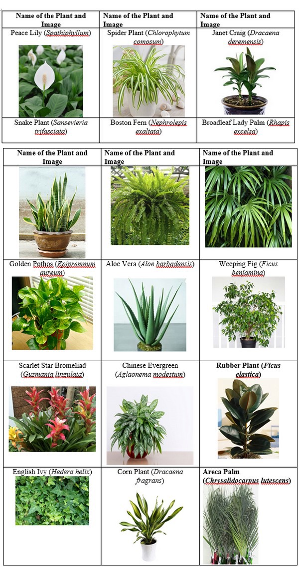 Among all these principles, for greener future climate smart technology for to counteract the problem for human health has become a great challenge. It is estimated that 7 million people die from air pollution every year. Luckily for us, research has indicated that certain house plants act as a natural filter to indoor pollution. In fact, NASA-conducted research into the power of plants indoors found that there are over 50 houseplant types that remove pollutants and gases. Most of these plants require medium light to bright, indirect sunlight, average, 25% to 49% humidity and average 18 to 23 ℃ temperature ( except Aloe vera , requiring at least 4 hours of direct sunlight per day, average 20 to 35 ℃ temperature) . The soil must be kept moist, but not water logged. These all are useful against air pollution and may improve indoor air quality by up to 60 and % Removes 80% of VOCs ( Volatile organic compounds) from the air in only 12 hours. Some are extremely effective in its ability to absorb harsh chemicals like carbon monoxide, benzene, formaldehyde. Some are toxic to humans and pets if ingested. And some plants (like peace lily and Scarlet Star Bromeliad ) can be useful in areas of high humidity – like bathrooms as it will keep the mold at bay. Among the list given by NASA, total 15 readily available species are discussed in Table given below: