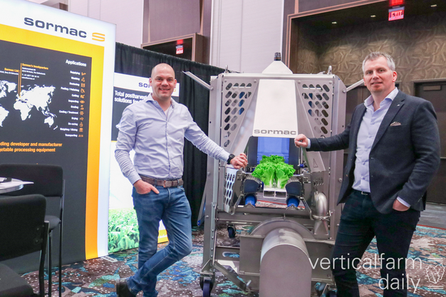 Leafy greens of whole head lettuce? Not an issue for Sormac's latest harvesting machine, with Luuk Rutten and Roy Lemmen proudly showcasing it.