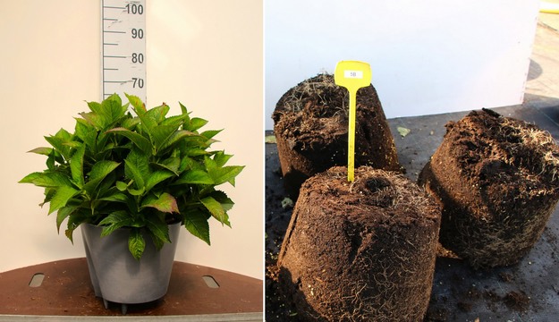Alongside the indoor trial, they also conducted an outdoor trial with Hydrangeas. This trial lasted longer as it involved a thorough examination of the effects of winter, watering, and other factors. The trials ended at the end of August 2023, and a final report followed by mid-October. The researchers established a rating which was based on factors such as visual plant quality, fresh weight (leaf mass), and root development. The rating once again demonstrated that the Ecopots Venice 2 performed exceptionally well, as was shown by the plant's weight, which was the highest measured. This high weight was the result of an integrated water reservoir that continuously provides the roots with a sufficient amount of water. Natural capillary action ensures that water continuously reaches the upper parts of the plant.