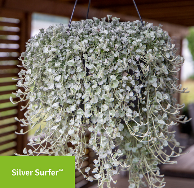 "With superior germination rates (85% +) complemented by our BeGreen seed treatment, this variety ensures faster growth due to its outstanding root development. With silvery leaves, a trailing growth up to 60" (150 cm), and a strong performance under hot and dry conditions, Dichondra argentea Silver Surfer is suitable for hanging baskets, mixed containers, groundcover, or indoor use," the Benary team states.