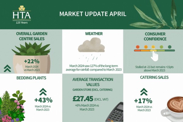 The Horticultural Trade Association (HTA) released its April 2024 Market Update, showing that despite another wet and rainy month in March, garden center sales surged by +22% compared to March 2023, helped by the earlier Easter. Catering sales were also up by +17%. Consumer confidence also remained stable from February, showing a +15-point increase over March 2023.
