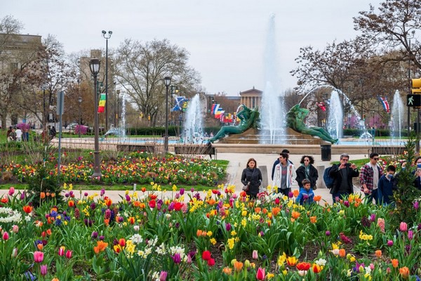 Moving down the parkway to Logan Square, visitors will find this space transitioning from spring ephemerals such as hyacinths, crocuses, and daffodils to a vibrant display of over 50,000 multi-colored tulips. Peak time now through mid-late April.