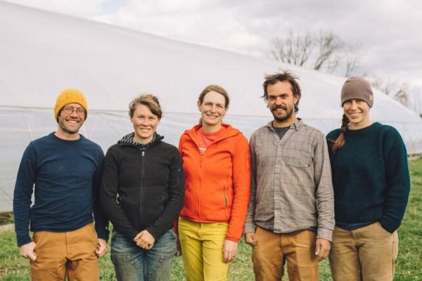At right: Collective Farmers in 2020: Eric Kampe (left the farm in 2022), Hannah Weber, Jill Lada, Nate Lada, Michelle Brosius.