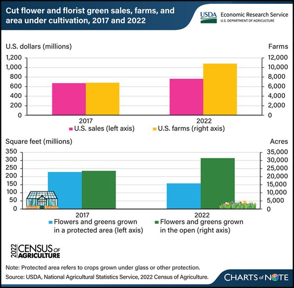 Growers throughout the country reported more than 158 million square feet of protected-culture flower and green production in 2022—the equivalent of almost 2,750 football fields. Despite the advantages to greenhouse production, growing flowers conventionally is on the rise in the United States. In 2022, more than 31,000 acres of flowers were grown in the open, an increase of 33 percent from the 2017 census. Domestic cut flower sales increased $90 million from the 2017 census, not adjusting for inflation. The value of imported flowers also increased over that time. Cut flower imports were valued at $1.9 billion in 2022, an increase of $783 million from 2017. This chart is based on data from the NASS 2022 Census of Agriculture and draws from the USDA, Economic Research Service Outlook for U.S. Agricultural Trade: February 2024.