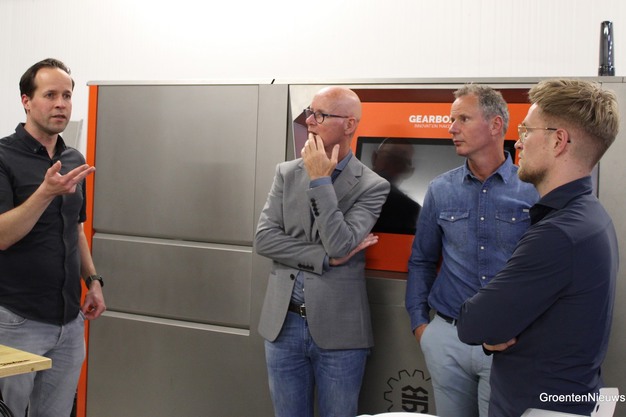 John Duijnisveld (far left) beside a row of 3D printers with attentive listeners including Esmee van Breugel (GroentenFruit Huis) and Hans Driessen (BASF/Nunhems).