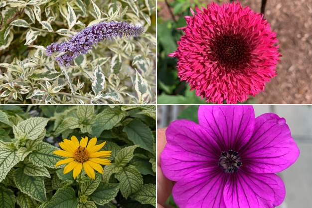 Clockwise: Buddleja 'Butterfly Gold', Echinacea 'Lovely Loly', Heliopsis 'Oriole Variegata', and Geranium 'Hexam Velvet'
