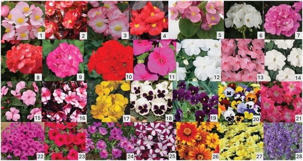 Photo 4. Twenty-five different plant cultivars and the pollinator benchmark standards evaluated in the study. Photo by Smitley et al., 2024.