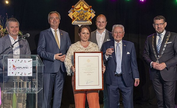 Hofland Flowering Plants received the predicate 'Purveyor to the Royal Court ' on Friday 21 June 2024 at the 125th anniversary celebrations. This makes them the first Westland greenhouse horticulture company to be allowed to carry the Royal Coat of Arms with the addition of 'By Royal Order purveyor to the Royal Court'. Deputy King's Commissioner for South Holland, Meindert Stolk, presented the certificate to the Hofland family in the presence of Mayor Bouke Arends. Frans Hofland, third generation and now 91 years old, unveiled the coat of arms.