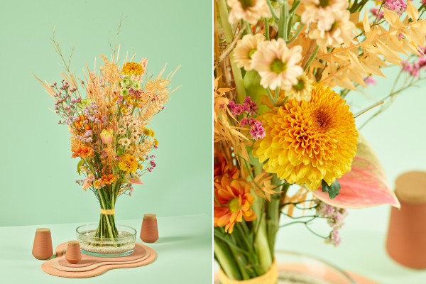 In the 'Soft Shore' trend, flowers and organic shapes come together as an ode to the artist Henri Matisse. Wood carvings with round shapes are used as a backdrop for the flowers. The familiar Boho style changes to Mobo or modern Boho. Here it is all about asymmetrical shapes, and pastel shades with some color accents. The base is formed by branched liguster branches, combined with fluffy chrysanthemums and complemented by spray chrysanthemums and santinis.