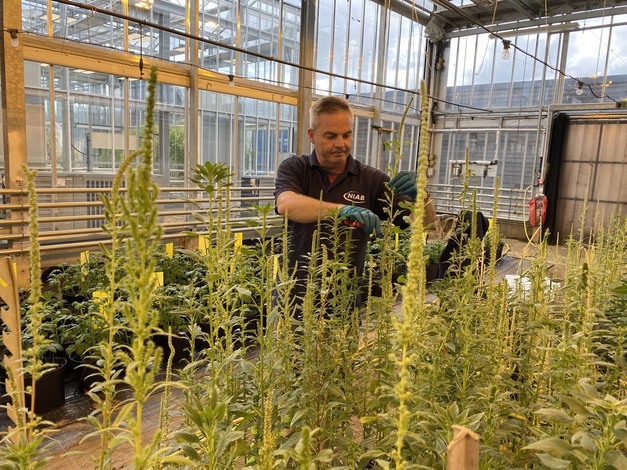 Seed Bulking Service: Niab's team offers seed multiplication and maintenance for a range of crops, including barley, cowpea, legumes, lentils, maize, soy, and wheat. Here, Stephen Morley is harvesting Amaranthus seeds.