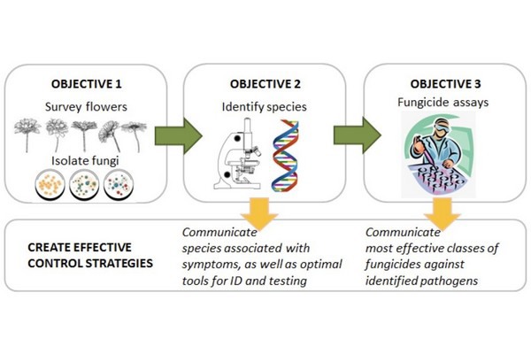 We have an efficient system for processing flower samples to record symptoms and isolate associated fungi and we are ready to process our next season of samples. The data we are generating will be of use to growers throughout the area and potentially wherever environmental conditions are favorable for the pathogens. Our goal is to characterize symptoms with specific pathogens. We will continue to characterize symptoms and identify fungi involved until we can unite the two together. We look forward to sharing the results of our work with the industry.