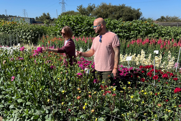 Kelly Meringolo (InFlora Cut Flowers) and Drew Groezinger (Clara Joyce Flowers) viewed new dahlia breeding.