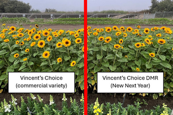 Sakata also showed upcoming introductions of the new Downy Mildew resistant versions of their Vincent's® Sunflowers. Available in 2025, Vincent's Choice DMR and Vincent's Fresh DMR will be introduced. "They have the added benefit of downy mildew disease resistance." These trials were grown by InFlora Cut Flowers at their trial site in Salinas with Green Valley Floral.