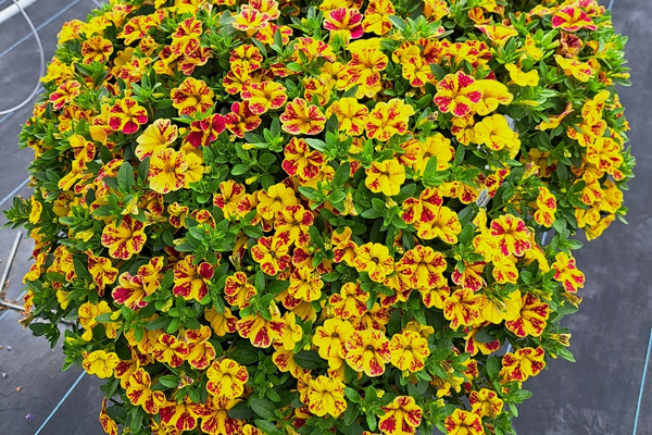 "Lia Abstract Lemon Cherry Calibrachoa was a top ten performer at Plantpeddler's Variety Days in Cresco, Iowa. This new introduction is retail-ready with loads of golden yellow flowers that feature a splash of cherry. This medium vigor calibrachoa is the perfect addition to hanging baskets and combinations."