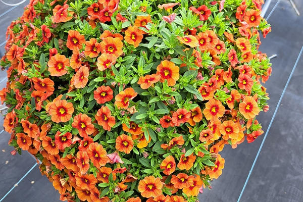 "Danziger's Eyeconic Calibrachoa series features large blooms in gorgeous colors. Eyeconic Orange was a standout at several trial locations including the Penn State Flower trials (image location). This calibrachoa brings juicy citrus colors to the garden, with bright blooms and a deep orange eye. Stunning on its own in hanging baskets and containers, this calibrachoa also blends beautifully in combos."
