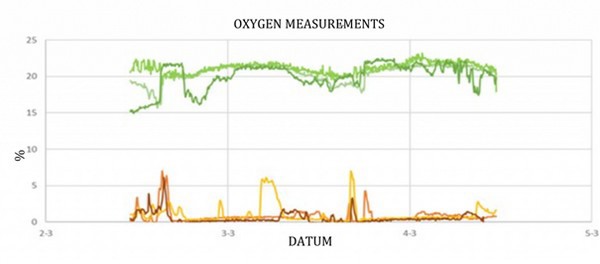The yellow line is the oxygen content in standard horticultural recirculation water. The green line is standard horticulture water after treatment with the machine. The percentages say something about the percentage of oxygen measured in the water.