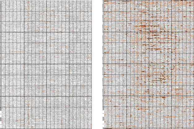Graphical representation of the Excel showing that the energy market has changed very quickly in recent years. On the left is data from 2019, and on the right is from 2023. The browner, the lower the imbalance compared to the APX, and the greener the higher the imbalance compared to the APX. Enlargement of the graphical representation of the data is available, for 2019 and 2023.