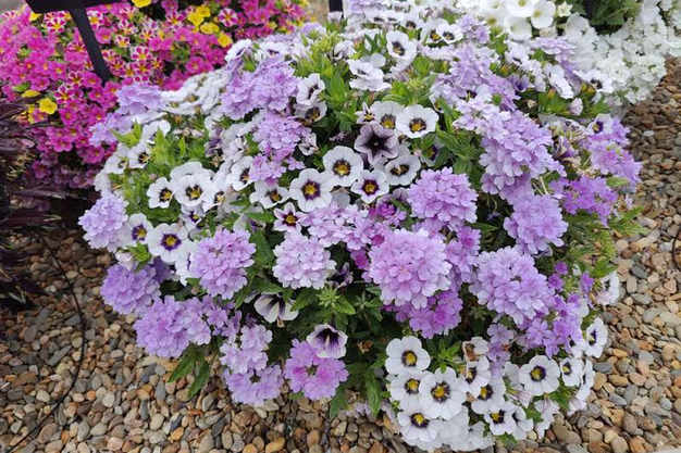 Annual varieties on display during the summer trials included such flowers as Begonia I'Conia First Kiss Del Sol, Confetti Garden Trio Mix Blueberry Parfait, Geranium Big EEZE Pink Batik, Lantana Heartland White 2025, Scaevola Scala Capello Series and Verbena Empress Sun Kiss Series.