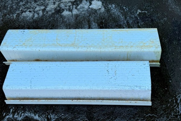 The upper gutter was cleaned only with water and a pressure washer. The lower gutter was first sprayed with GA-Clean and cleaned with a high-pressure sprayer with water after a 5-minute soaking time. "Here residual inorganic salts were removed. Using only high-pressure water does not succeed."