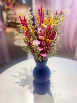 "Our trendy Vibrant bouquet, made up of various dried flower types and colour schemes, has a CO2 emission of just 0.53 kg. This figure encompasses everything from sowing the flowers to harvesting, drying, packaging, and preparing for transport—essentially from cradle to gate. This CO2 footprint is comparable to making a cup of coffee with milk or sending an email with an attachment. The average CO2 footprint of a bottle of wine is 1.3 kg CO2, while that of a chocolate bar is 1.78 kg."