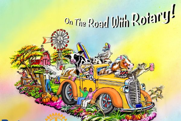 Rotary's float, "On The Road With Rotary!," features lively farmyard fun and windmill whimsy. A classic truck, loaded with a quirky crew of barnyard buddies, takes center stage as it races away from a flower-covered farmhouse. At the top of the float, a cool cat snaps a selfie with his horse friend, while a rooster, two playful dogs, a cheerful pig, and a pair of friendly cows join in on the barnyard shenanigans. Pumpkins, vegetables, and beautiful flowers spill from the scene, adding to the festive energy. A surfboard suggests a trip to the beach, and a spinning windmill whirls in the breeze, completing this joyful celebration of Rotary's community spirit. Rotary International puts together the mastery of this Rose Parade float through fundraising efforts alongside more than 6000 Rotary clubs in the U.S. and Canada. Rotary International has a global network of more than 1.2 million neighbors, friends, and leaders who volunteer their skills and resources to solve issues and address community needs. Get on board and on the road with Rotary!
