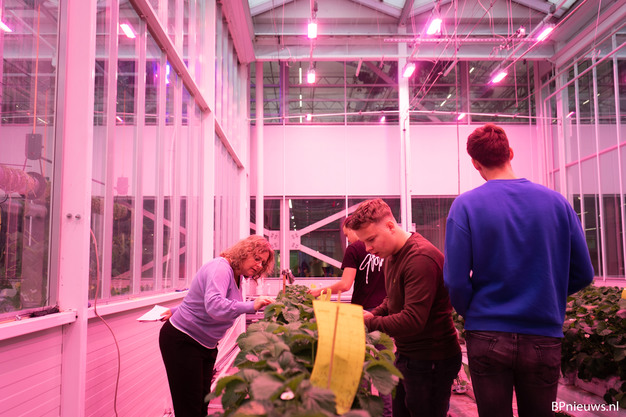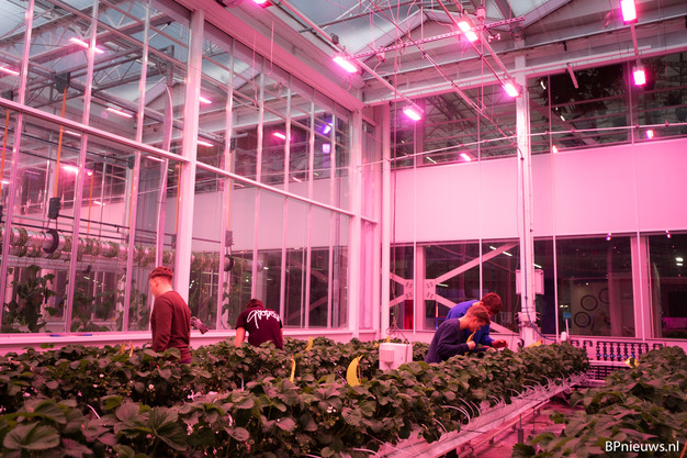 In one of World Horti Center's greenhouses, four students from the Horti Technics & Management course are busy growing young strawberry plants. The LED lighting is turning the greenhouse 'pink', the plants are getting fruit and there are bumblebees are flying around.