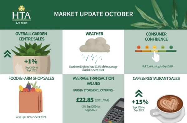 The latest Horticultural Trades Association (HTA) Market Update for October 2024 shows that overall garden centre sales in September 2024 increased by +1% compared to September 2023, driven largely by catering and non-garden categories. However, overall sales were down by -1% when excluding catering. In a dominant narrative for 2024, this is reflective of the challenges for garden-related sales in periods of adverse weather, seen across all areas of the UK.