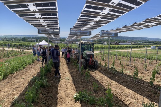 VitiCult project in Geisemheim, Germany, using Mirai Solar's photovoltaic shading system (field view). Reference: https://www.ise.fraunhofer.de/en/research-projects/viticult-pvmobil.html