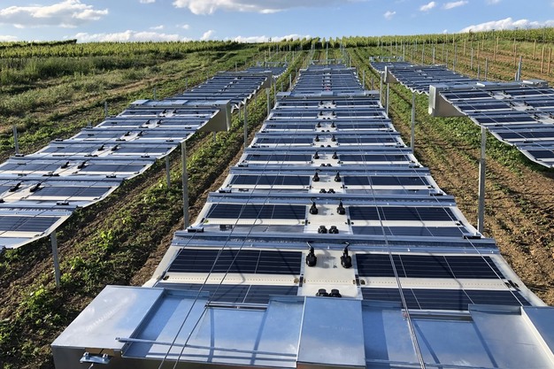 VitiCult project in Geisemheim, Germany, using Mirai Solar's photovoltaic shading system (field view). Reference: https://www.ise.fraunhofer.de/en/research-projects/viticult-pvmobil.html