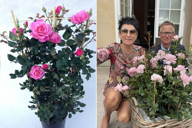 On the left: The award-winning 'Our Last Summer' rose from Plant'n'Relax garden rose series will be shown together with 3 other new fragrant garden roses. On the right: Rosa and Harley Eskelund with Winner Takes it all Plant'n'Relax, a fragrant climbing rose. Sister to 'Our Last Summer' rose