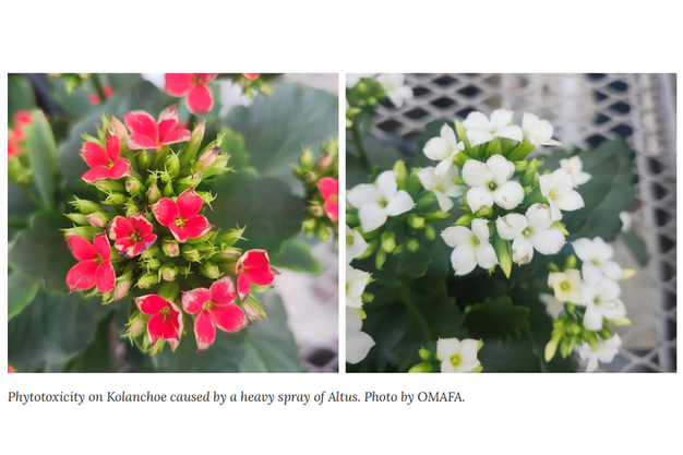 At a high spray rate, Altus may cause some spotting on open blooms of Kolanchoe. This was moreapparent on dark blooms than light. There have been no reports of effects on other crops as of yet. (BUT, see the section below on how these tests were done). No phytotoxicity was seen on any of the foliage, even on young plants.