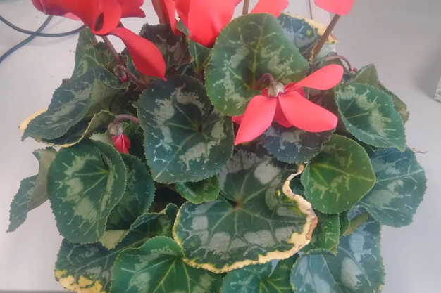 © Photo by OMAFAClassic leaf margin burn on Cyclamen from phytotoxicity after spraying Pylon. Photo by OMAFA.